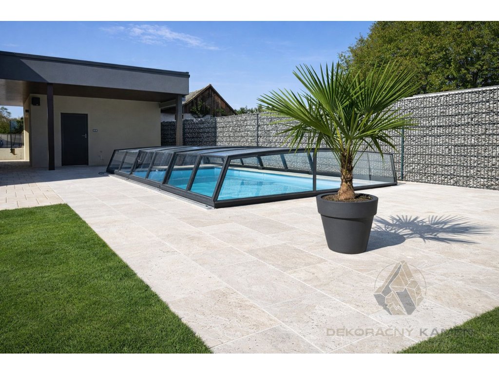 Travertínová dlažba Classic v hrúbke 3 cm je ideálnou voľbou pre okolie bazénov, terasy a záhradné chodníky. Prírodný travertín v svetlo béžovom odtieni vytvára nadčasový, harmonický vzhľad a pôsobí prirodzene v každom exteriéri.